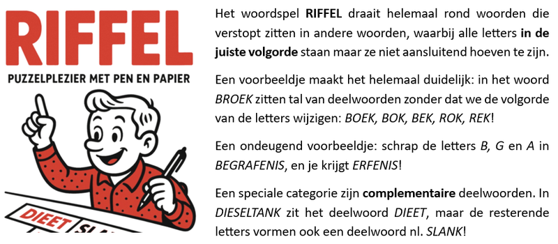 Na mijn boekjes WoordSkipper en Riffel is er nu een budgetvriendelijk RIFFEL speelsetje. Een speelsetje kost 10 euro waarvan 8 euro naar de Vlaamse Parkinson Liga gaat. Mijn doel is 125 setjes te verkopen tegen 31 dec 2025 middernacht. Klik op de flyer linksonder voor meer info.
